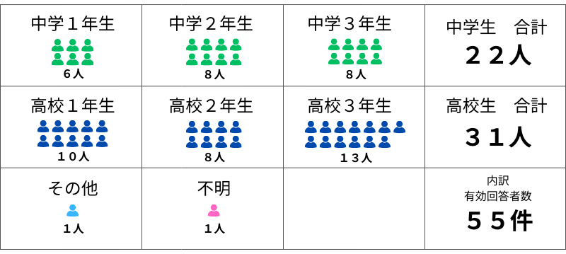 2023年6月~9月に、全国の中高生コーダを対象としたwebアンケート調査を実施し、55名から回答を得ました(詳細は以下の表のとおり)。